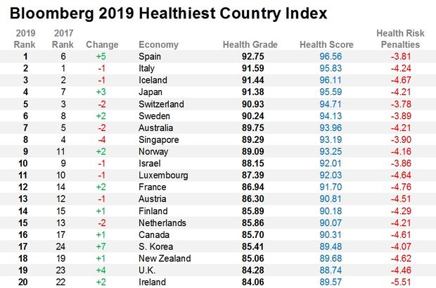 Spain topped Bloomberg’s list of the healthiest countries this year, topping 2017’s healthiest country, Italy. Japan, Iceland, and Switzerland rounded out the top 5.