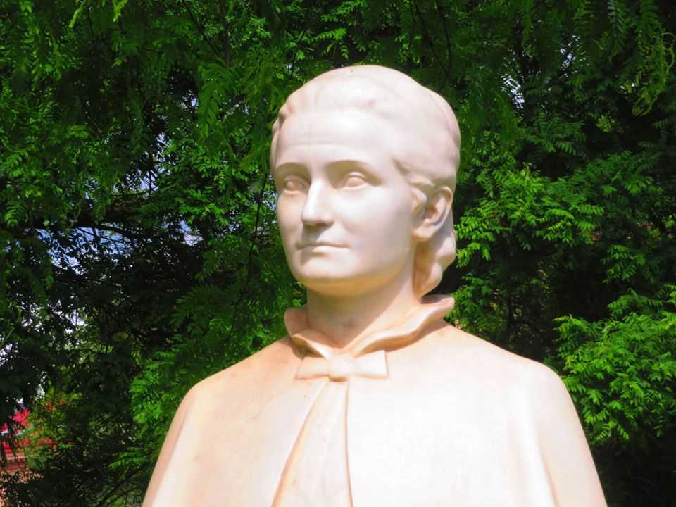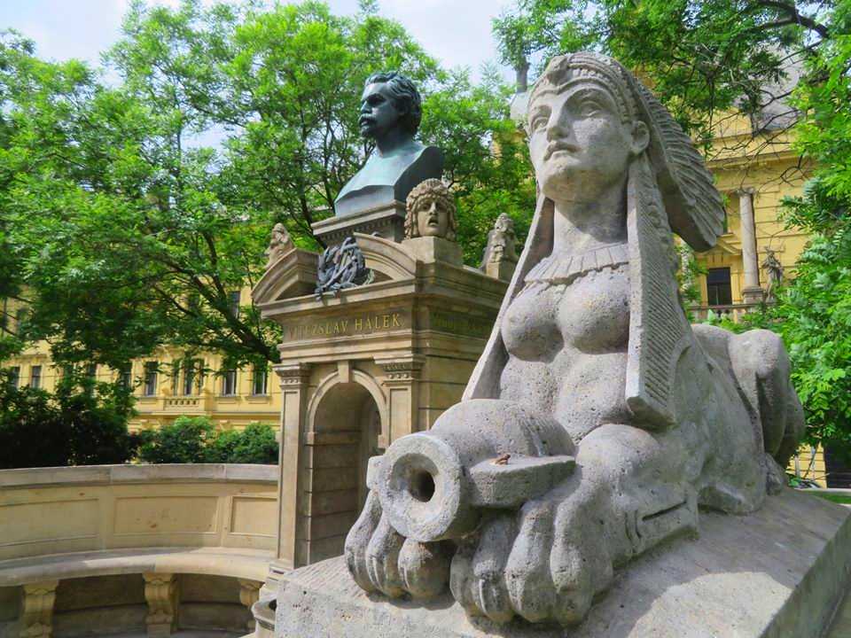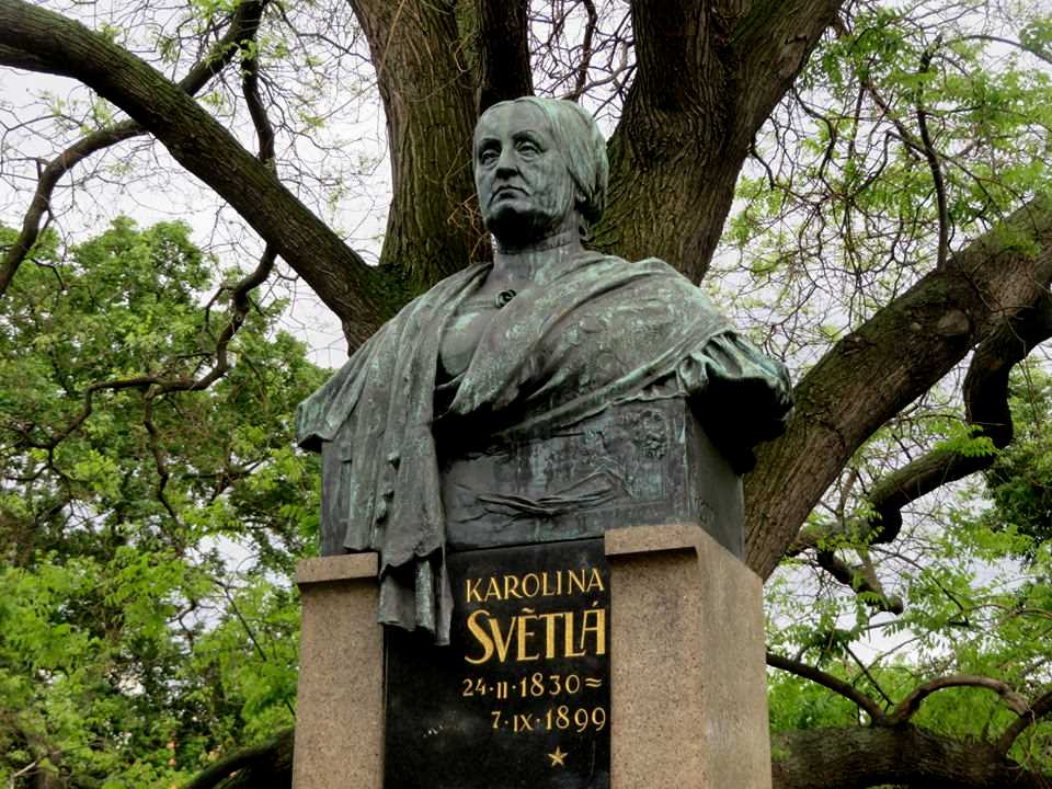 The metal bust of 19th century author writer Karolina Světlá greets people entering the park from the Karlovo náměstí metro stop. She is known for literary realism and rural themes, as well as her relationship with Jan Neruda.