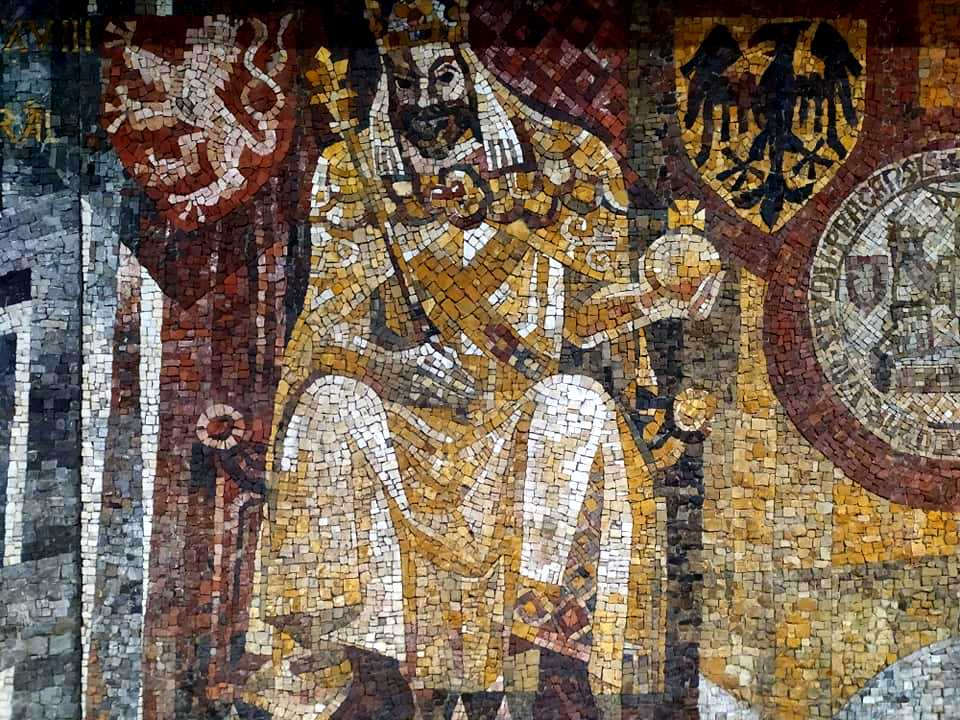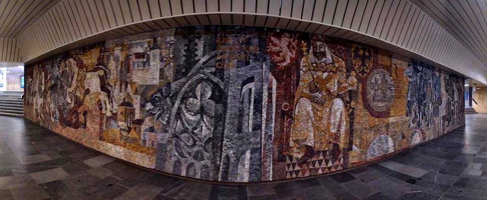 Another hidden artwork is under the square, in the metro station. A large mosaic depicting Emperor Charles IV and life in the 14th century was installed during the communist era in 1985 as part of the station’s art. It was designed by Radomír Kolář and František Tesař.