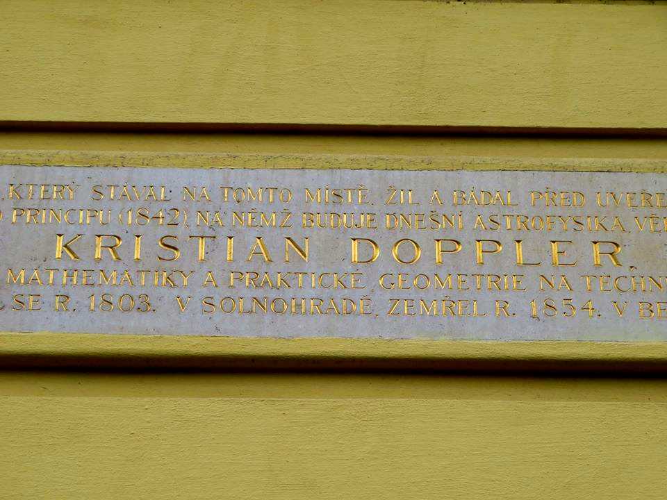 One the side of Municipal Court building, adjacent to the New Town Hall and facing the park, is a plaque for Christian Doppler, who taught at what is now the Czech Technical University in Prague (ČVÚT).