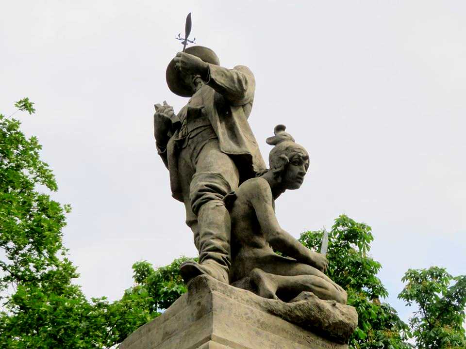 The sandstone statue with bronze details, erected in 1898, is by Gustav Zoula and Čeněk Vosmík. Unmentioned in the inscription is an almost nude Native American youth carrying a metal hunting knife. It was previously a bronze machete, but recently it was changed to something a bit smaller. The whole statue is a rather elaborate affair with bronze chains, steps and built-in benches.