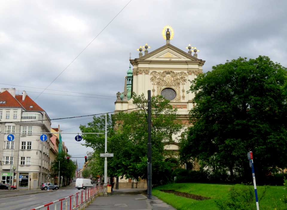 While the massive St. Ignatius Church (Kostel svatého Ignáce) has been on the east side of square since 1677, there was originally another church in the square. The first Corpus Christi Chapel (Kaple Božího těla), made of wood, was in the center of the square from 1354 until it was replaced by a stone church that stood for 1393 until it was deconsecrated in 1784 and demolished in 1789.