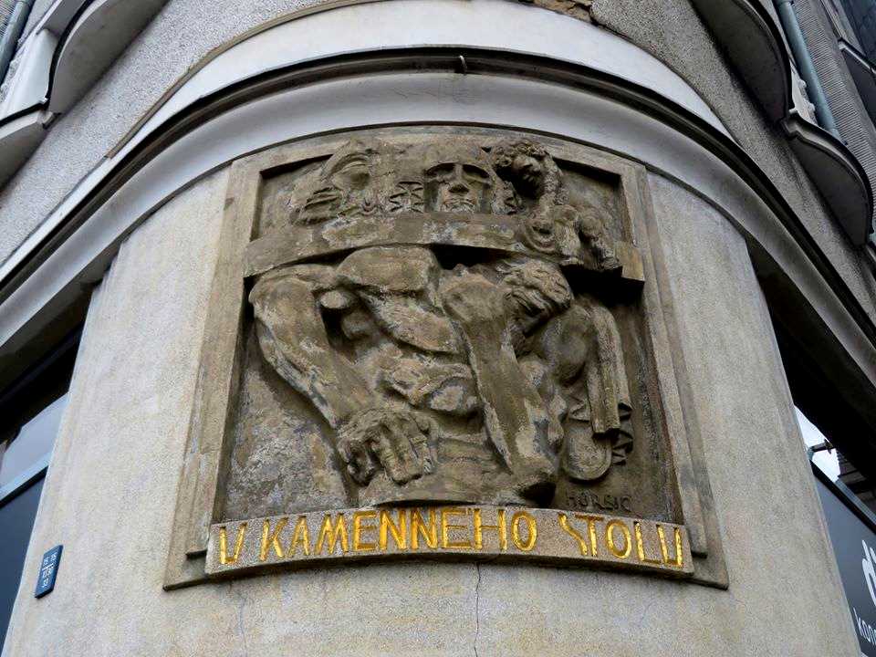 A red granite plaque at Ječná 550/1 marks where writer Karolina Světlá died, another plaque on the same building says it is the House at the Stone Table (dům U Kamenného stolu). That plaque is by sculptor Jaroslav Horejc.