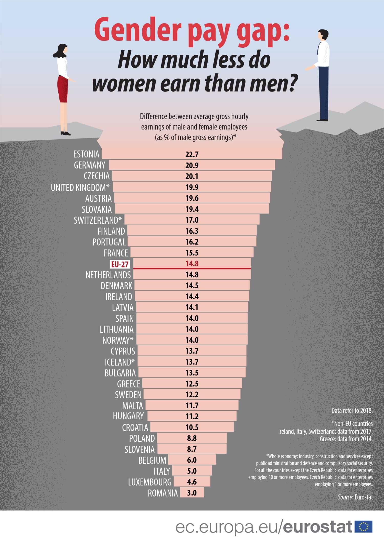 According to statistics released by the EU statistical arm Eurostat in early March 2020, based on data from 2018, the gender gap in was the third-worst in the EU-27, with women earning 20.1% less than men based on the average gross hourly earnings. Figures from the Czech Statistical Office (ČSÚ) show a similar long-term trend.