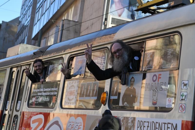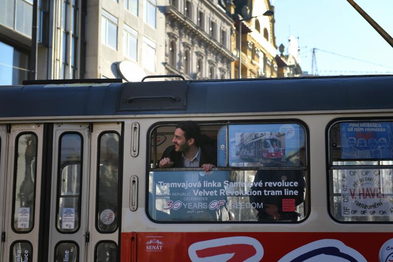 Inside the tram, passengers can learn about the celebrations of this year’s 30th anniversary of November 17. “The exterior of the tram is supposed to remind us of Václav Havel’s presidential campaign and there is space to show how we celebrated the changes that occurred 30 years ago. Passengers will be able to view photos from the six most prominent places of celebration —Albertov, Národní, Wenceslas Square, Letná and two parades — and read a short description of each organization and celebrations,” Lukáš Černý, chairman of event organizer Díky, že můžem (Thanks That We Can), said.