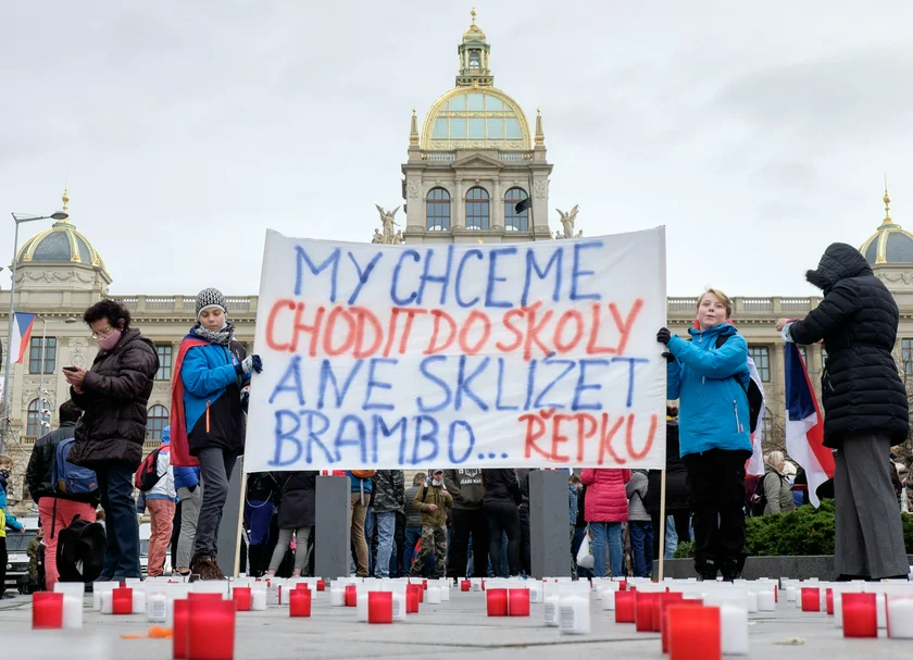Demonstrators carried Czech flags and banners with anti-government inscriptions, such as "Even Viruses Are More Capable than the Government." During the march, people chanted slogans, "Freedom, Freedom!", "Children to Schools" and "We Want to Go to Work."
