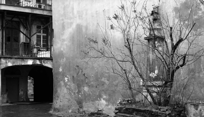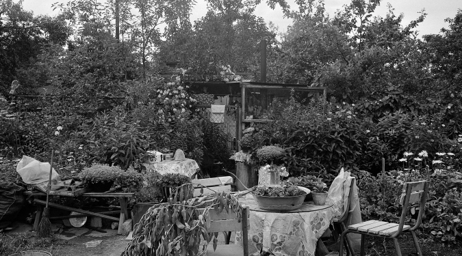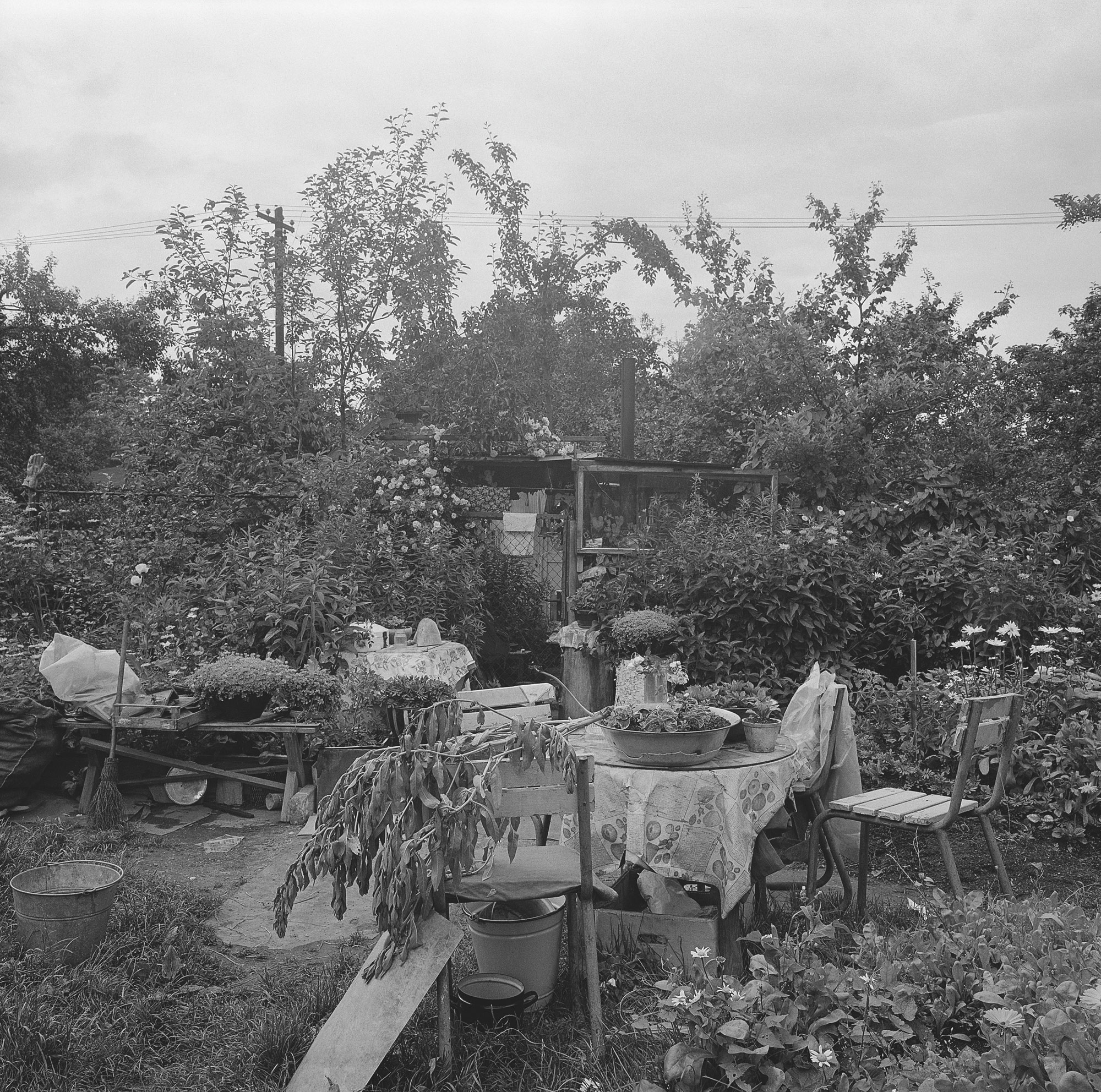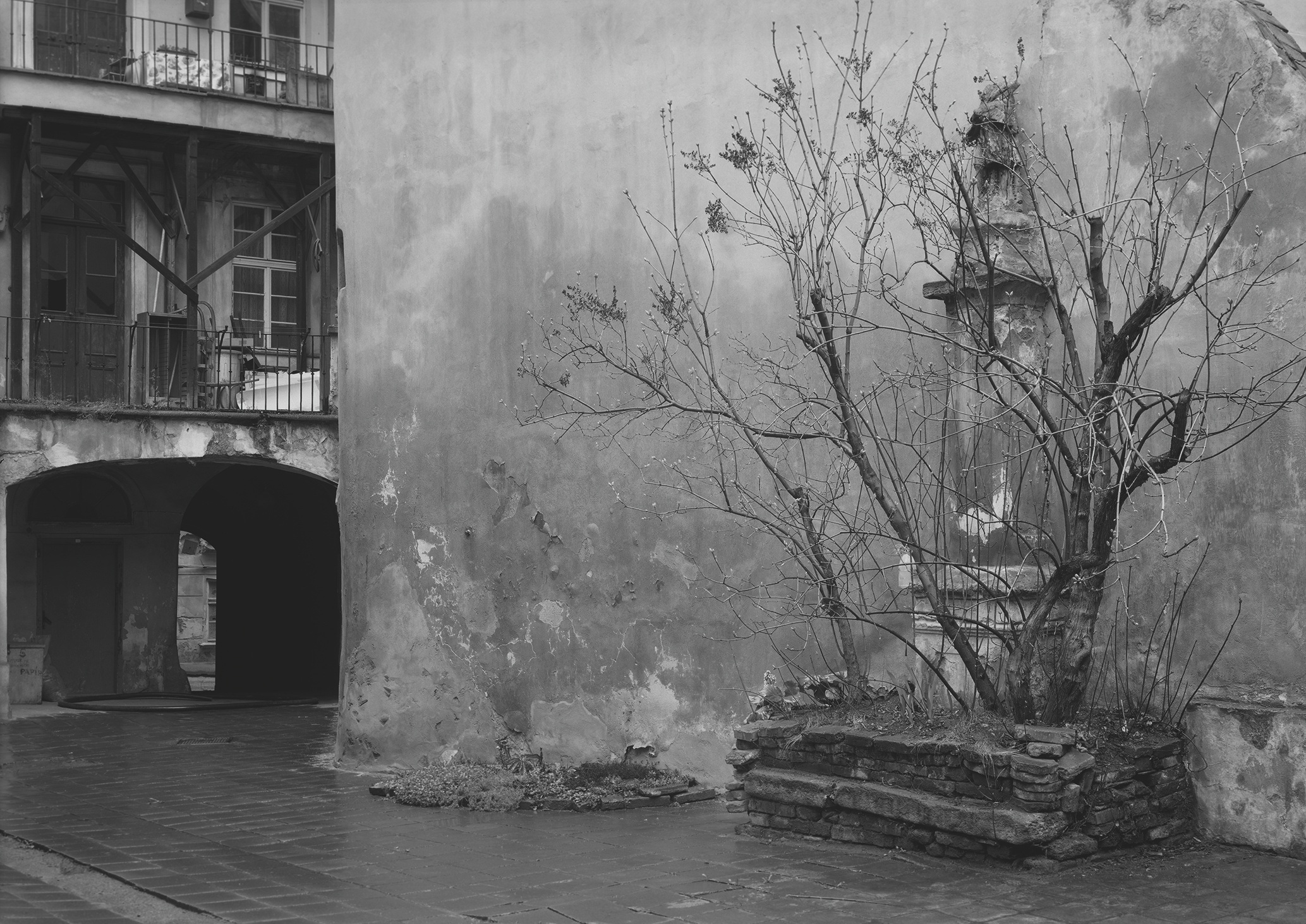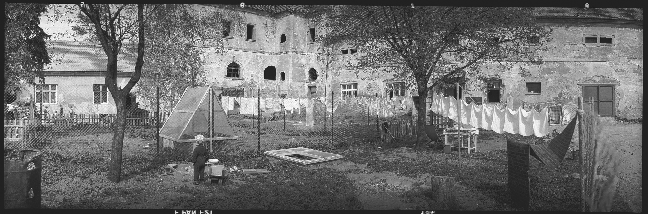 Take his photograph of the chateau-turned-agricultural-cooperative in Klášterní Skalice. Glassless windows stare blindly out of the crumbling facades at a courtyard crisscrossed by chain link fencing and cheap greenhouses. Only a line of pristine pillow cases brings domestic order to the ruin. In the lower left corner, a little boy stands next to a wooden wagon behind one of those fences, gazing wistfully at children playing two yards – it might as well be two worlds – away.