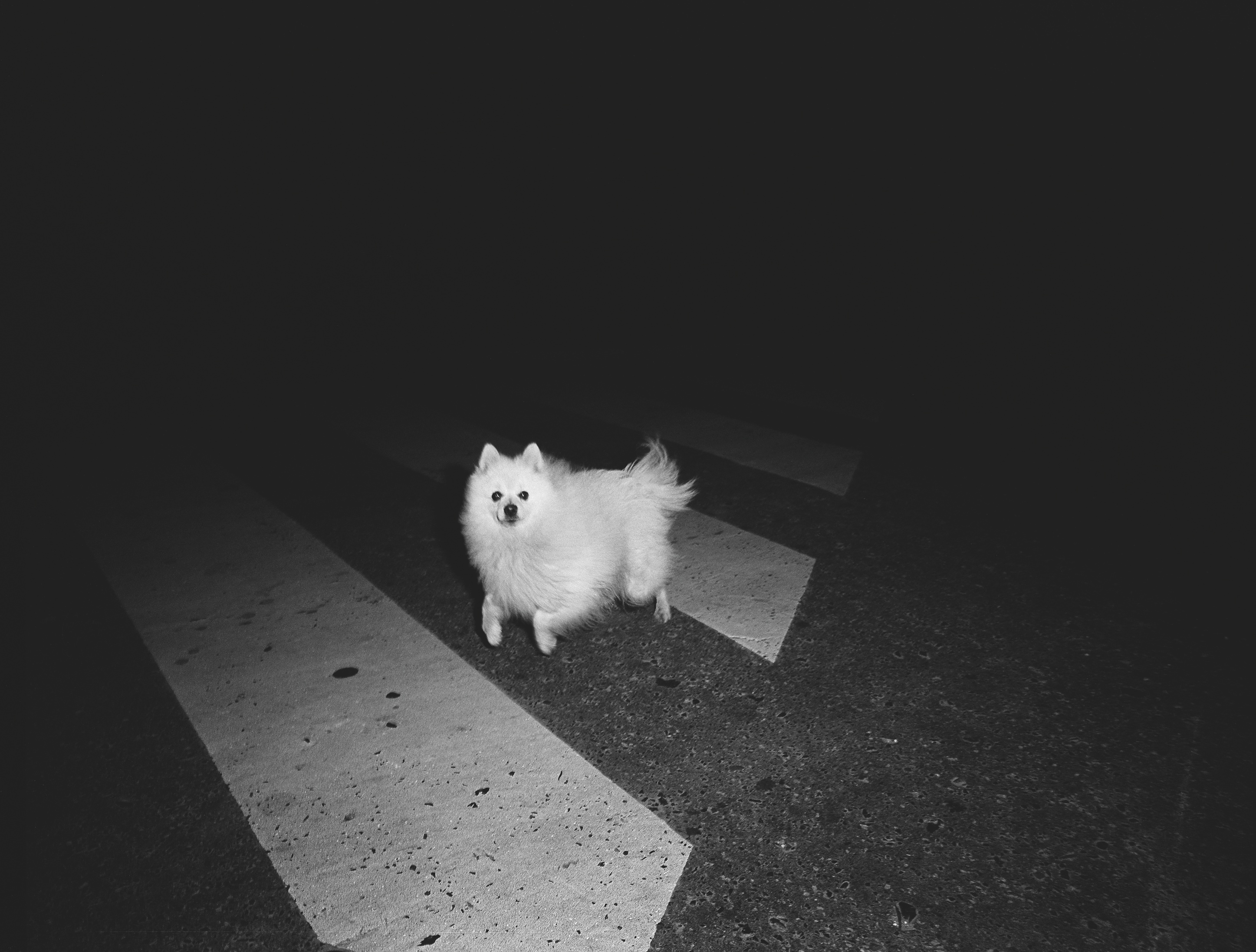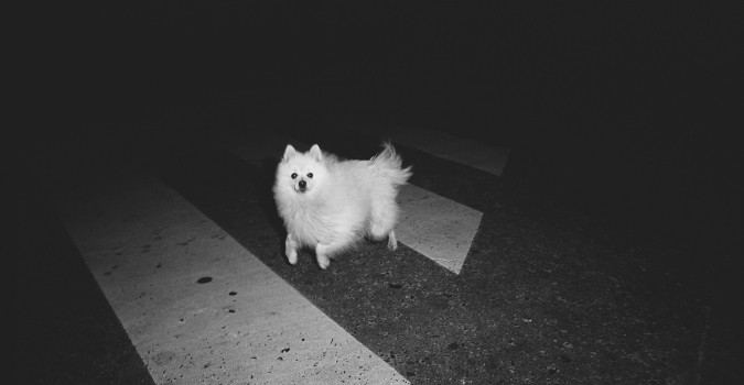 In one particularly terrifying photo, a fluffy white Spitz prances in a crosswalk, alone and unsuspecting of danger.