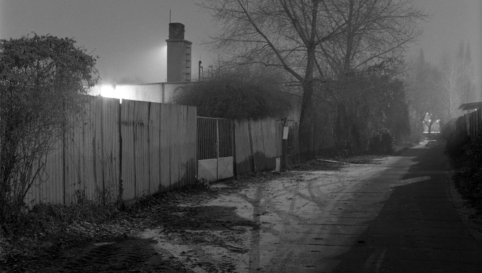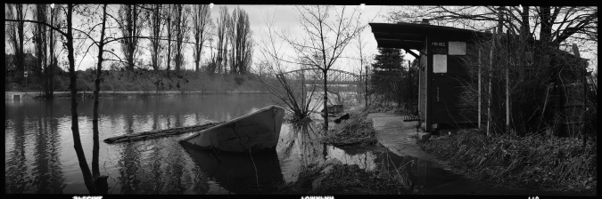 Another titled only “Císařská louka 1976” (Emperors’ Field 1976), shows an abandoned shack on the bank of the Vltava. The view from the porch is marred by scrawny willow trees. Heaps of rotting grass, washed up by spring overflow, line the walls. In front, the prow of a boat sticks helplessly out of the water. In the distance looms a steel bridge. It is up to the observer to realize that the Císařská louka was a river island built at great expense as a weekend destination for the citizens of Prague, or to decipher a sign on the wall: the shack was once a ferry station. Both it and the boat have been rendered useless by the bridge.