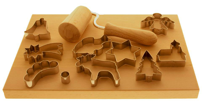 Available at Prague show room or purchase via e-shop 319 CZK for 10 stainless steel cutters, beechwood roller and cutting board