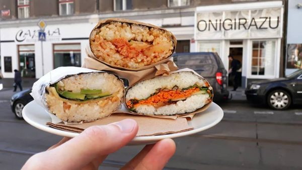 This started as a food fad in Japan and quickly caught on to become its own thing, and now there’s a place in Prague that does it. Onigirazu are basically onigiri, which are rice balls with fillings, sometimes round and sometimes triangular, but with a wrapping of seaweed, so the whole thing is sort of a sandwich. Because it’s a “new” thing, people have a tendency to think outside the box when it comes to fillings. At this Prague 7 spot, they call it a “sushi-sandwich”, except that their stuff is mainly vegan. So, things like ponzu coleslaw with smoked tofu; smoked carrot with dill, sesame, cucumber and lemon mayo; Thai basil, pear, peanut, cabbage, spinach and tofu. The menu changes all the time. This is a pretty unique thing.