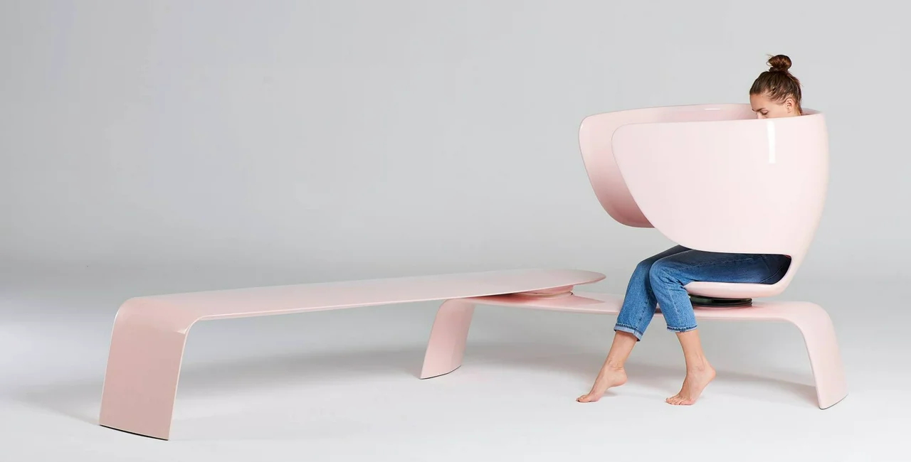 The contraption, which looks like a giant swiveling teacup attached to a sleek L-shaped bench is meant to be installed in shopping malls, parks, airports, and other public spaces. It won a RedDot design award in 2019.