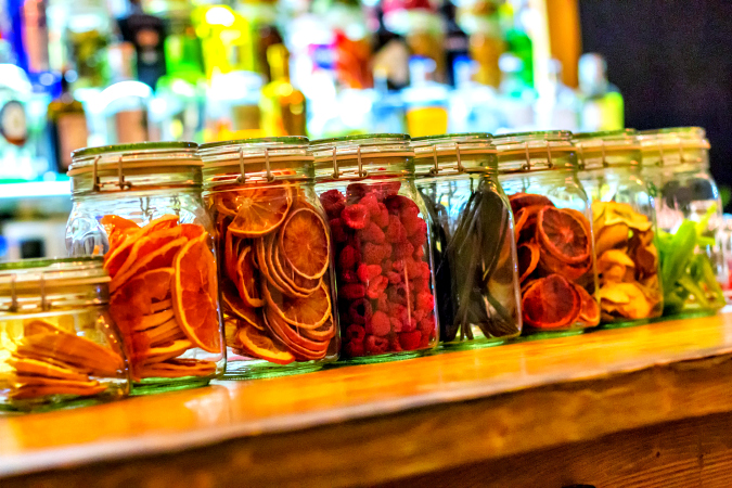 5. Place 1-2 pieces each of dried fruits and garnishes into the cocktail.