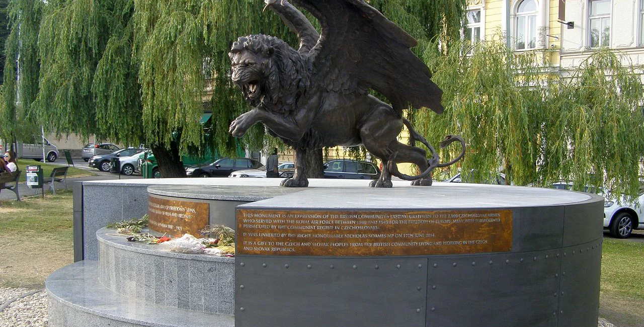 In Prague, there is now a monument to the Czechoslovak air personnel who served with the RAF. The Winged Lion, at Klarov near the Malostranská metro stop, was erected with private funds. It was unveiled June 17, 2014, in the presence of Sir Nicholas Soames, grandson of Sir Winston Churchill.