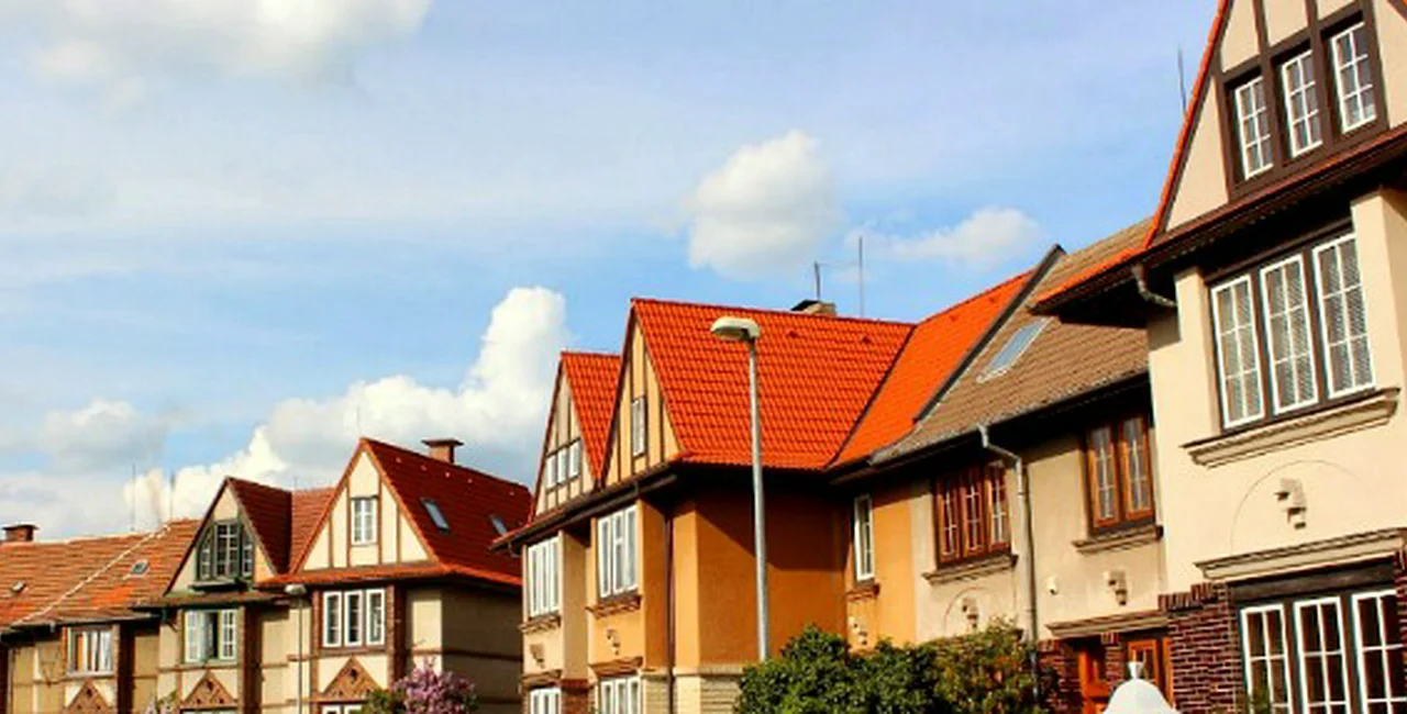 These row houses in the Ořechovka luxury villa district, built between 1920-1922, imitate the English cottages that can be found in garden townslike Bedford Park, Hampstead, or Letchford with their typical triangular gables, narrow rectangular windows, high chimney, and half-timbered masonry bond.
