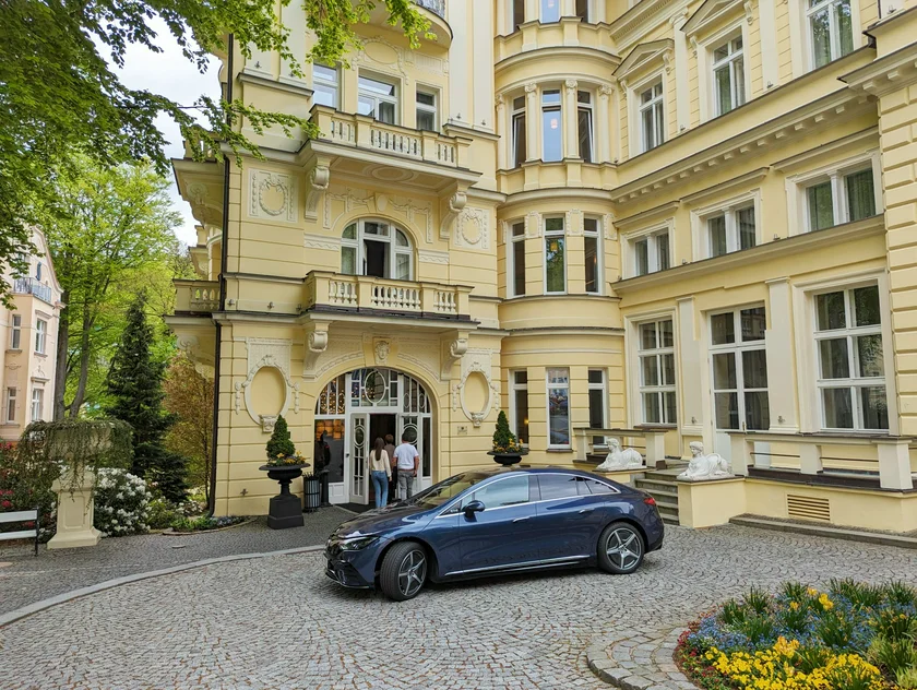The car was fully charged before setting out, and would easily be getting us to Mariánské Lázně, approximately 170 km to the west of Prague, without needing a top up. The Mercedes has a range of approximately 600 km on a full charge in the city and around 550 km when driving on highways or countryside roads. It takes only about 15 minutes to charge the EQE for about 250 km driving range.