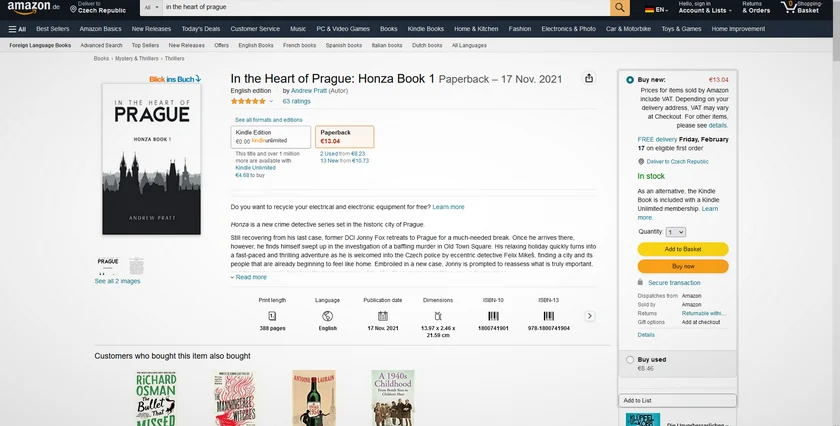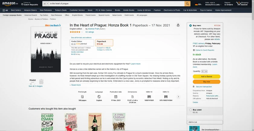 Readers in Prague can buy the Honza books from the Megabooks bookshop (formerly Oxford Bookshop) in Prague 2, or online at megabooks.cz. The books are also available in paperback and ebook/kindle format from any Amazon domain. Delivery to addresses in the Czech Republic is possible with orders from amazon.de.