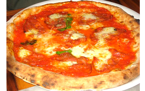 The menu says it comes with spicy Ventricina salami, fresh cow milk mozzarella, San Marzano tomatoes, fresh basil, Grana Padano cheese, olive and sunflower oils.