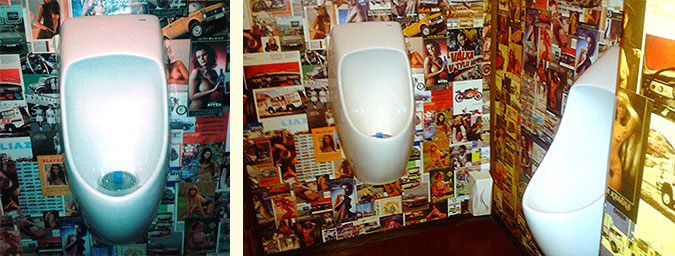 Growing up I had a scrapbook and whenever I would find a cool magazine clipping with my favorite car or some singer or band I liked, I would cut it out and stick it in the book with a flour-and-water home-made glue mix. The walls in the gent’s toilets in Lokál on Dlouhá do seem to be a big kid’s scrapbook. The cutouts from vintage porn mags are a bit more grown-up than the cutouts I had, but essentially it seems like the same thing. The combination of the cool cars and scantily clad women on display seems very out of character for this fairly conservative Dlouhá beer hall, but I’m definitely not complaining.