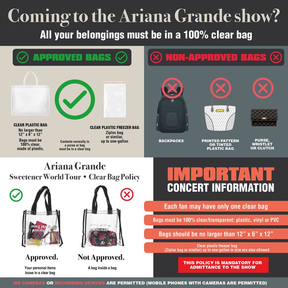 Most importantly, concertgoers will only be allowed in if all of their possessions are in a clear plastic bag. The bags must be no larger than 12 inches by 6 inches by 12 inches (30 x 15 x 30 cm), or A4 format. One-gallon (3.7 liter) freezer bags are also allowed. Each person can only have one bag.