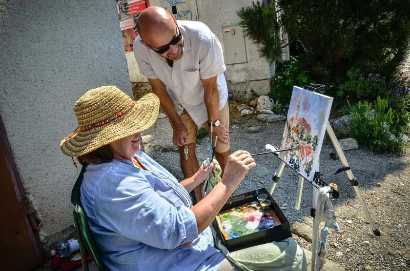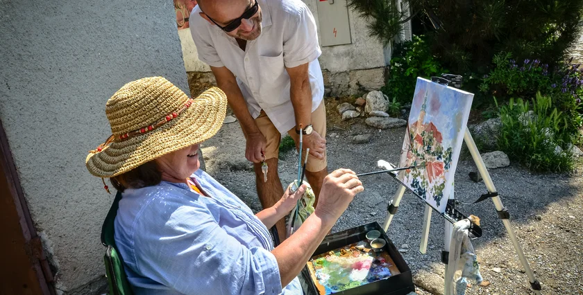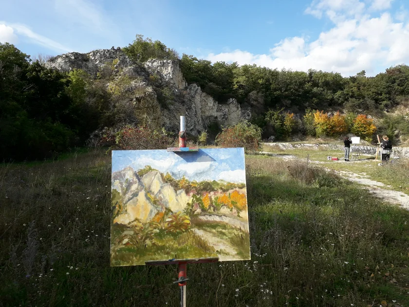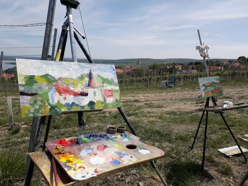 Her studio occupies a historical Renaissance sgraffito building in Mikulov’s central square. While classes often end on the terrace with evening music and sipping Rutherford wines, in good weather the class spends the days capturing the beauty of the Pálava hills, lakes, and vineyards in vibrant brushstrokes and tasting at local wineries along the way.