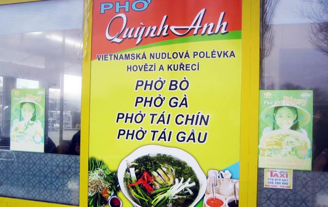 On a more recent trip, accompanied by a cooking instructor and a couple of fearless meat eaters, I braved a tiny kitchen at the end of a dim pasáž, poised between a green grocer and a ping-pong table. From low stools we enjoyed near-boiling bowls of pho, a soup of chicken or beef and wide rice noodles steeped in a fragrant broth flavored with ginger, black pepper, lemon, and shallots. Our chicken pho was topped with thin slices of chicken and a few pork meatballs, along with fresh basil, cilantro, and spring onion. Dressed with a variety of the tableside condiments—pungent fish sauce, lemon juice, pickled garlic, and chili paste—the variety of flavors was bountiful. A generous bowl of pho was 80 CZK.