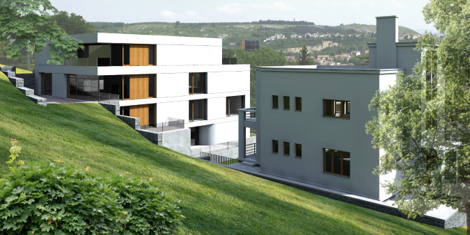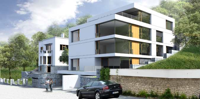The nine flats will all be different; some of them will have views over the valley that stretches in front of the building while some will have terrace and access to the garden. The top floor is one big flat with a large sundeck on the roof. Everything that doesn’t need light and could be hidden (parking, storage) is concealed under the terrain.