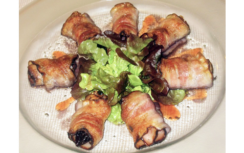I was in the mood for something decadent, so I ordered the dried plums wrapped in bacon (75 CZK).