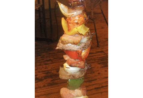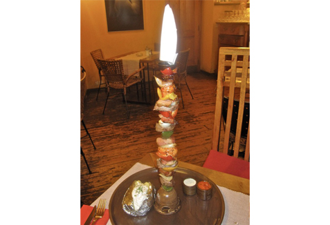 The hot iron skewer, with a mix of beef, chicken, and pork, was delivered to the table standing vertical. On the side were a cold tomato sauce, a cold garlic cream sauce, and a baked potato with sour cream.