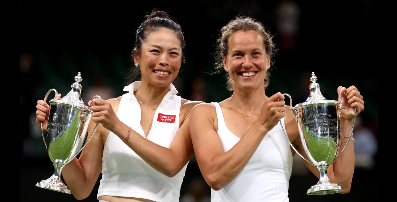Hsieh Su-Wei and @BaraStrycova capture the Ladiesâ Doubles title, defeating Hunter/Mertens, 7-5, 6-4! #Wimbledonpic.twitter.com/dush6F0C2v
