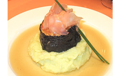 FF got Norwegian salmon again, but as a main course (205 CZK). It was wrapped, maki-style, in nori and then cooked. The fish was served over wasabi mashed potatoes.