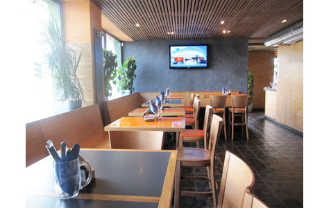 The interior has a modern-looking dining area with blond wood and clean lines.
