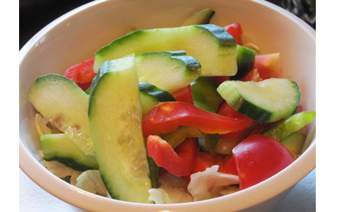 It was very basic and undressed — just cucumbers, peppers, tomatoes, and a few iceberg leaves. There was oil and vinegar on the table.