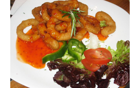 However, these rings were bigger and crunchier — sort of like fried breadcrumb rings, with not too much onion flavor. I was sorry they decided to pour sweet chili sauce over the top instead of putting it on the side.