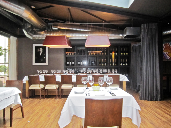 There are glassed-in wine racks, faux-hardwood floors, exposed duct work, brick walls and steel beams.