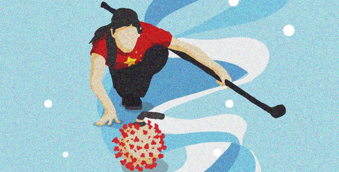 A fifth poster features a curler tossing a coronavirus molecule instead of a stone. Badiucao says that the Chinese government censored information regarding the scope of the Covid-19 outbreak during the early days in Wuhan, contributing to its rapid worldwide spread.