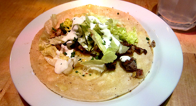 The pulled chicken had the light flavor of lime, though it was a little salty for me. They spice some dishes to order, and this one had mild heat, as requested. Also in the warm, soft corn tortilla were cheese, lettuce, salsa, a dab of guacamole, and sour cream.