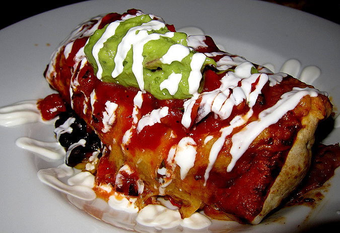 The baked flour tortilla sat on black beans and rice and was coated with salsa, guacamole and sour cream. It was big.