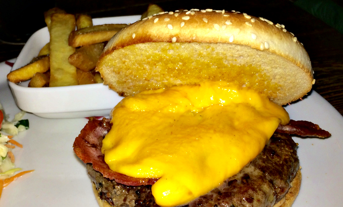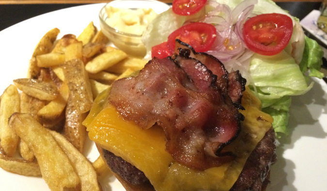 It took a strong recommendation from a friend to get me to leave the comfort of Prague 10 and trek to the wilds of Nebušice in Prague 6. I went by car, though I’m told buses go there. It’s a unique place in the basement of a hotel and connected to a bowling alley. The cheeseburger came with decent cheddar that picked up the smokey flavor of the patty. The patty had grill marks on it and was cooked exactly medium. There was also sliced pickle, mustard, lettuce, and diced onion. I asked for ketchup and got a small dish, which annoyed me. The bacon was good, but there was only a single half slice, which was bad. The bun was spongy and a little too dense. 175 CZK with weak fries and a good little salad.