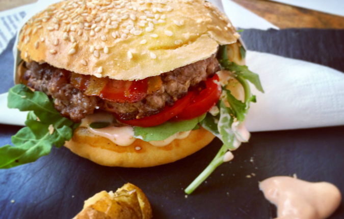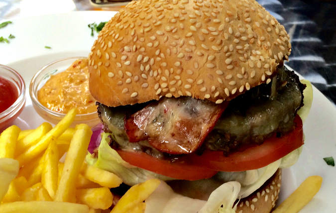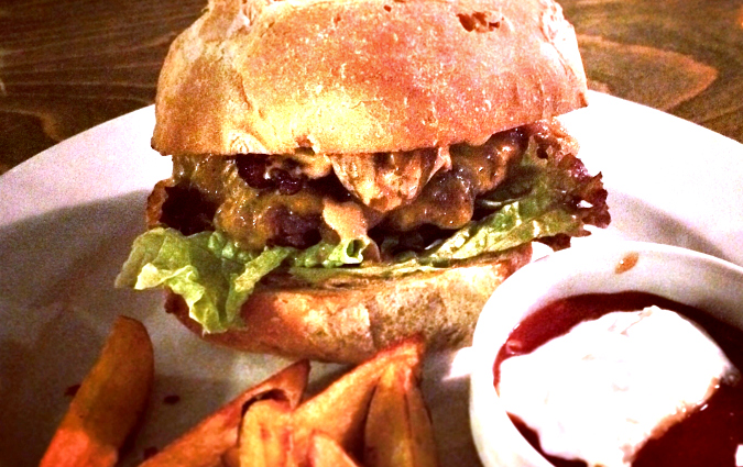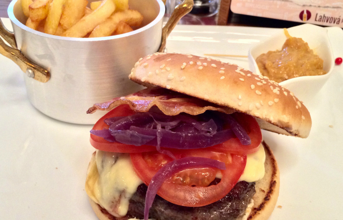 This Belgian restaurant’s mussels and beer have pulled in big crowds since it opened in March on Náměstí Míru. The website says its Belgian Beef Burger is made with “mature beef, au gratin with Brugge old cheese, served with grilled sweet onion, our chilli mayonnaise, home-made Bruxx fries and crispy bacon.” When I had it the week they opened, there was honey mustard sauce, a buttery-tasting cheese, tomato, and red onion. The reason I disliked this burger the most: the texture of the meat. It was more like a meatloaf than straight ground beef. When I had it, the burger was 195 CZK. The website now lists it at 229 CZK. The fries were short and stubby. I can only hope they improved it when they raised the price. My advice based on this version is to stay with the Belgian classics.