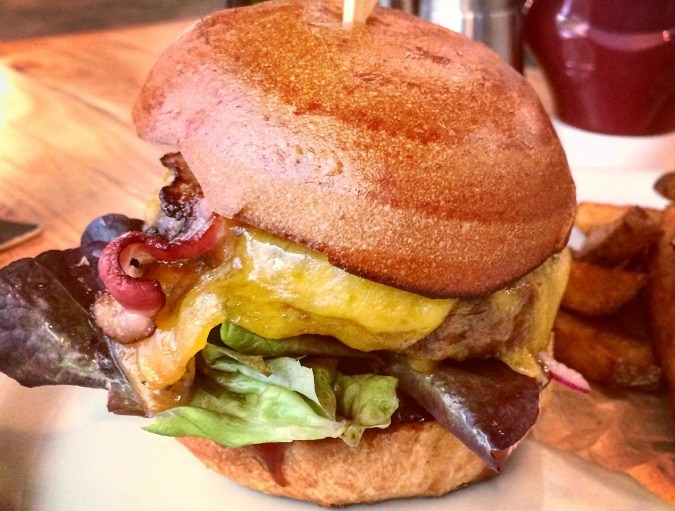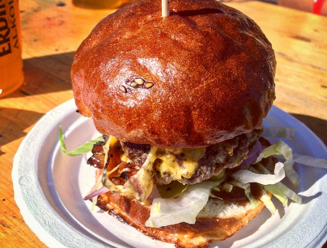 Dish was the winner for 2013 and 2014. Although almost consistently great, they slipped a bit this year. The Dish Burger I had came with the usual garlic aioli, pickles, lettuce, and their sweet homemade ketchup. The bacon was chewy and smoky. I’ve loved this burger for its balanced construction, and that was maintained. It’s easy to hold and eat all the way through. It lost its top spot because on the visit I chose to rate them, the patty was rather bland, lacking salt, and it didn’t have the good sear from the grill that it usually had. 195 CZK plus 45 CZK for fries (I highly recommend their sweet potato fries when they have them listed on the chalk board).