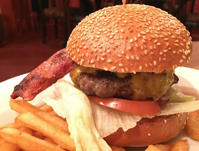 I trekked out to Prague 6 – Nebušice this summer, and I was glad I did. I didn’t expect to have such a great burger at this somewhat isolated spot under a hotel and connected to a bowling alley. The beef had just the right grind, not too fine. It tasted flame-grilled, like it just came off the barbecue. It was topped with three slices of excellent bacon, peppery cheese, lots of ketchup, mustard, lettuce, onions, and great sour pickles. The bun was much better than I remembered from the previous year. It was softer and more brioche-like. The patty was juicy, but not dripping too much. My hands did get a bit messy. I didn’t get a great picture of it, but this burger was well-composed, balanced, and tasted great. 175 CZK, fries and small salad included. Extra ketchup for fries was 20 CZK.