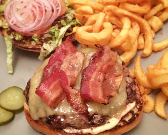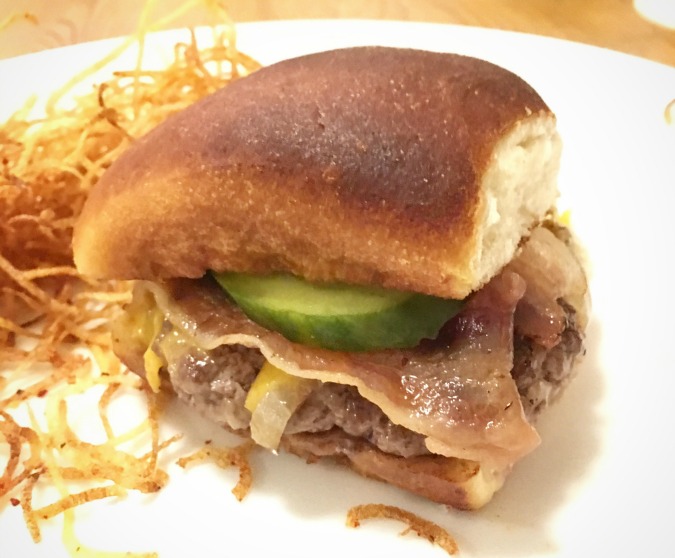 I prefer beef that is flame-grilled or griddled with a seared crust, cooked medium, and liberally salted. I like lightly crisp, smoked bacon. Toppings are better on the top or the side and should be sliced thin. On the bottom, they get warm and soggy.