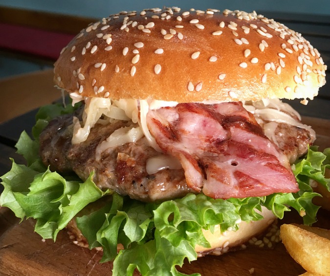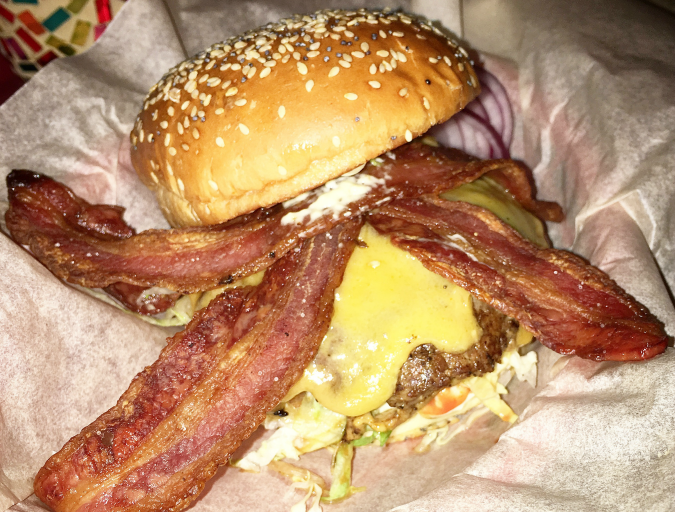 This burger was served at the Sale and Pepe food stand during a festival at Naplavka. The main positive here was the smoky, grilled flavor of the meat. The main negative was that the patty was seriously overcooked, too dense, and chewy. The bacon was undercooked. I don’t recall the price.