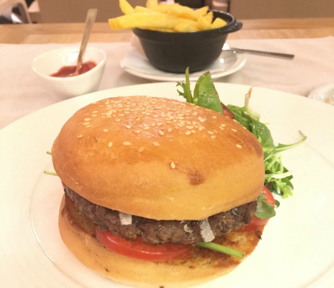 The Organic Burger with Parmesan sounds fancy. And they charge a fancy price. It was 260 CZK, plus 65 CZK for fries. One expects excellence from a famous chef like Zdeněk Pohlreich. But this pretentious burger had no true charm. I sent the first one back because the meat was barely room temperature, and the bun was cold. Even if I consider only the second burger, which was warm, but not hot, I did not like it. The patty was dry and under-seasoned. It may be high-quality ground beef, but it lacked the fat content to give it the right texture and flavor. The patty dripped juice, but was dry inside. The tomato confit was similar to sun-dried tomato spread. There was a scattering of cheese that looked more like a few little snowflakes. The whole thing was bland. I added so many twists from the salt-and-pepper grinders, I felt a case of carpal tunnel coming on. The large bun was dense and spongy. I got bored with all the chewing and did not finish it. The only real positive: the fries were great. For this kind of money, I expect to smile at more than just the fancy room.