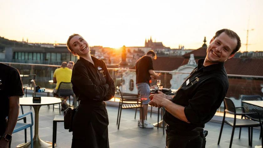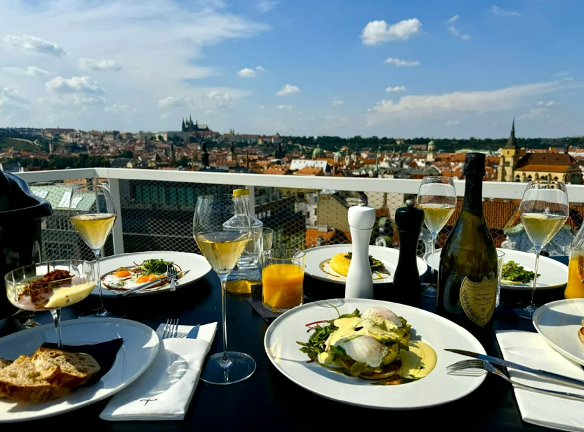The restaurant’s upper terrace, with its spectacular 360-degree panoramic view of Prague’s skyline, offers the perfect backdrop for any meal. Visitors are treated to unobstructed views of Prague Castle, Petřín Tower, the National Theatre, and more.