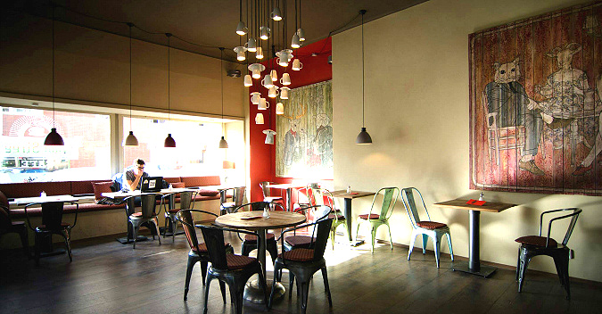Don’t be fooled by the name: there’s no aeronautical theme so you won’t see a Spitfire’s fuselage hanging from the ceiling. Instead, there’s a rather ingenious lampshade made from dozens of upturned coffee cups each housing an individual lightbulb: a delightful bit of upcycled décor. On the walls there are a couple of murals in which some sheep, a deer and a field mouse are dressed up like lords and ladies of the manor while enjoying afternoon tea. It’s all rather Downton Abbey meets Beatrix Potter. The rest of the interior is more standard: there are half a dozen tables in all, some of which have squishy seats (hurray!) and a small counter with bar stools overlooking the street with easy access to sockets if you’ve come to work on your laptop.