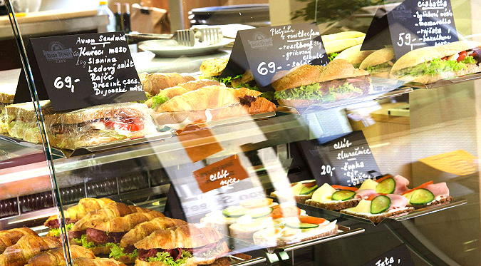 Although the glass counter where the cakes are is only half full, this is explained by the sign on the door: the café is in its “zkušební provoz” – trial period. However, there’s a still decent range of both food and drinks on the menu. I didn’t spot any quiche, but there was some chicken soup and Caesar salad available as lunch options as well as five different kinds of panini. There’s also a breakfast menu which includes scrambled eggs, mini frankfurters with bread and mustard (erm, yum) and the apparent attempt at a healthy option, chocolate muesli with yogurt and fresh fruit.