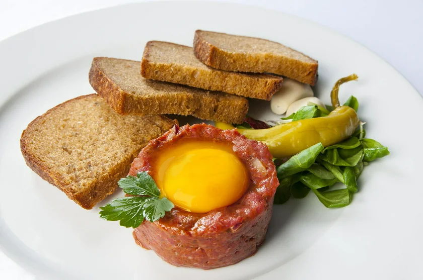 Appetizers on offer include veal croquette with coleslaw and butter sauce, or smoked carp tartare with dill sauce. Mains feature classic Czech dishes as well as options for vegetarians.