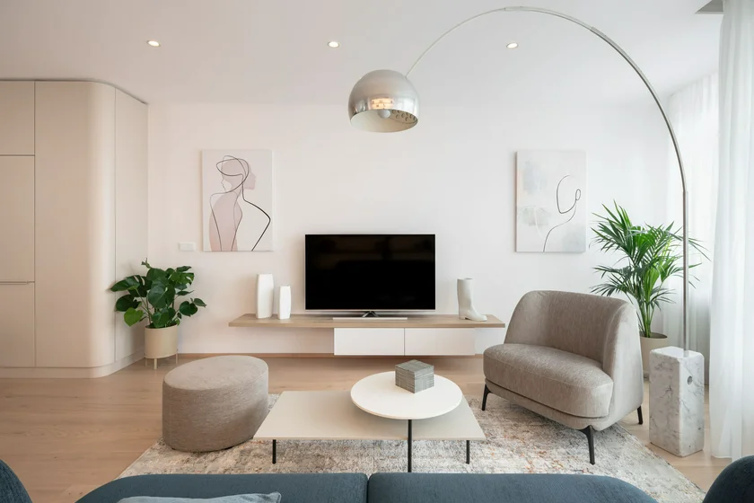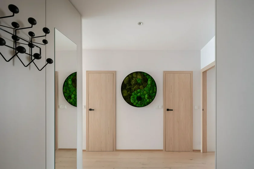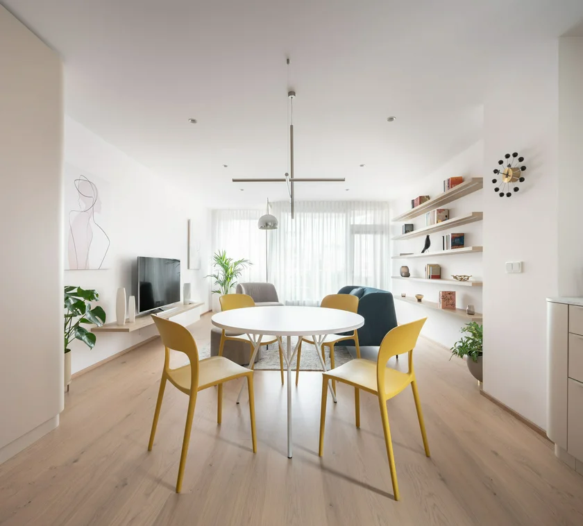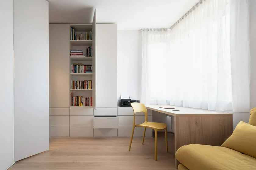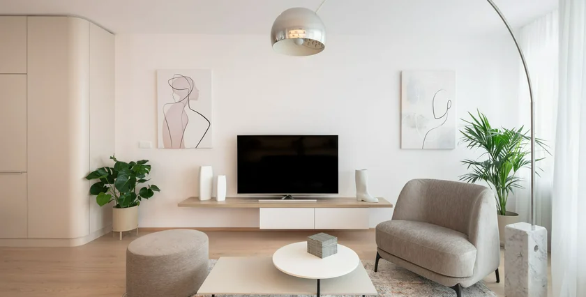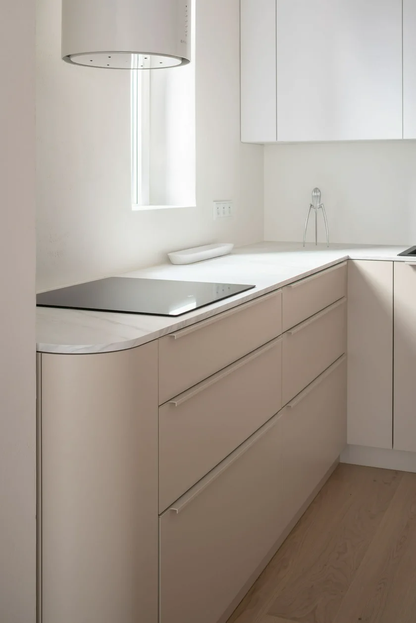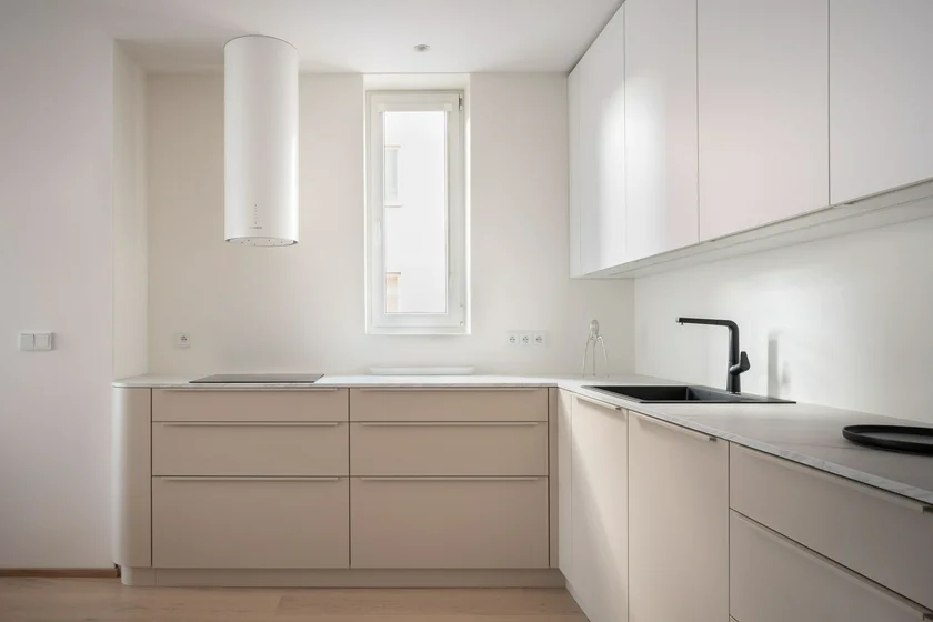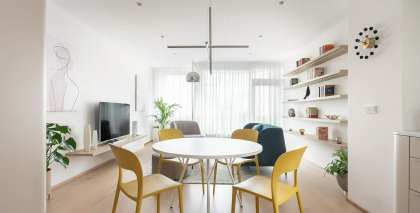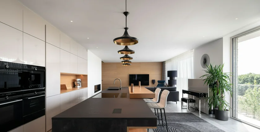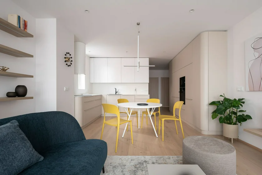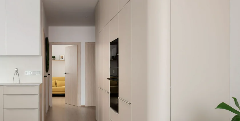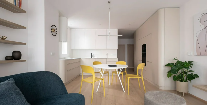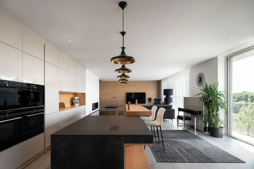 For one recent completion – an apartment in Prague’s Kateřinky district – the clients wanted to create an open, airy, well-lit space, dominated by beige and white tones. Casa Moderna opened up the space by knocking down the partition between the living room and the hallway, allowing natural light to pour in from the windows. The use of the rounded corners of the built-in wardrobes and kitchen cabinets softens and seamlessly connects the kitchen and living area.